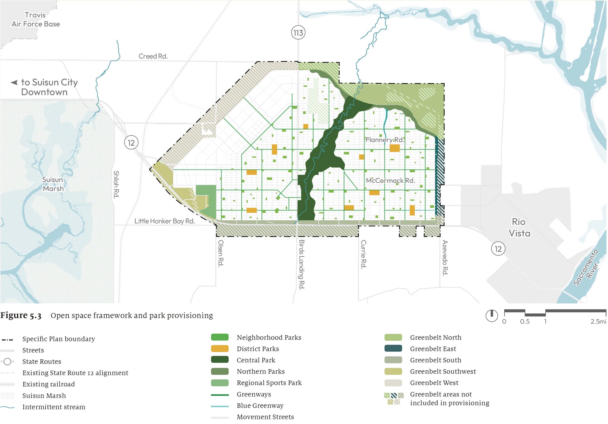 The application also includes a sweeping Travis Protection Zone of about 5,700 acres to protect military flight operations and a 1,410-acre Lambie Industrial Park, whose uses would remain as currently permitted by Solano County.