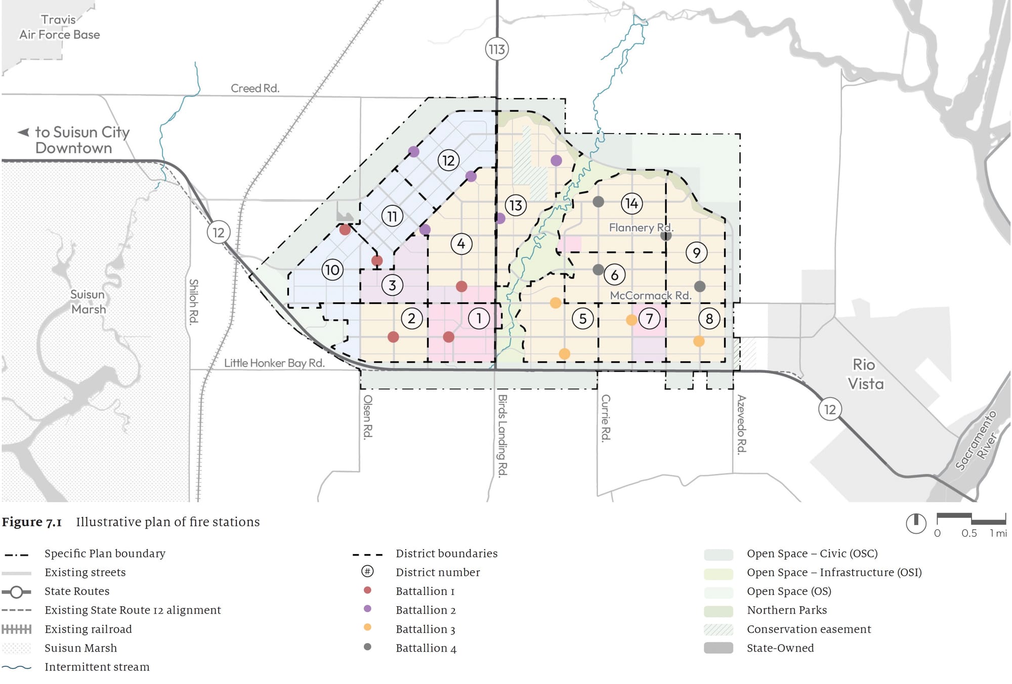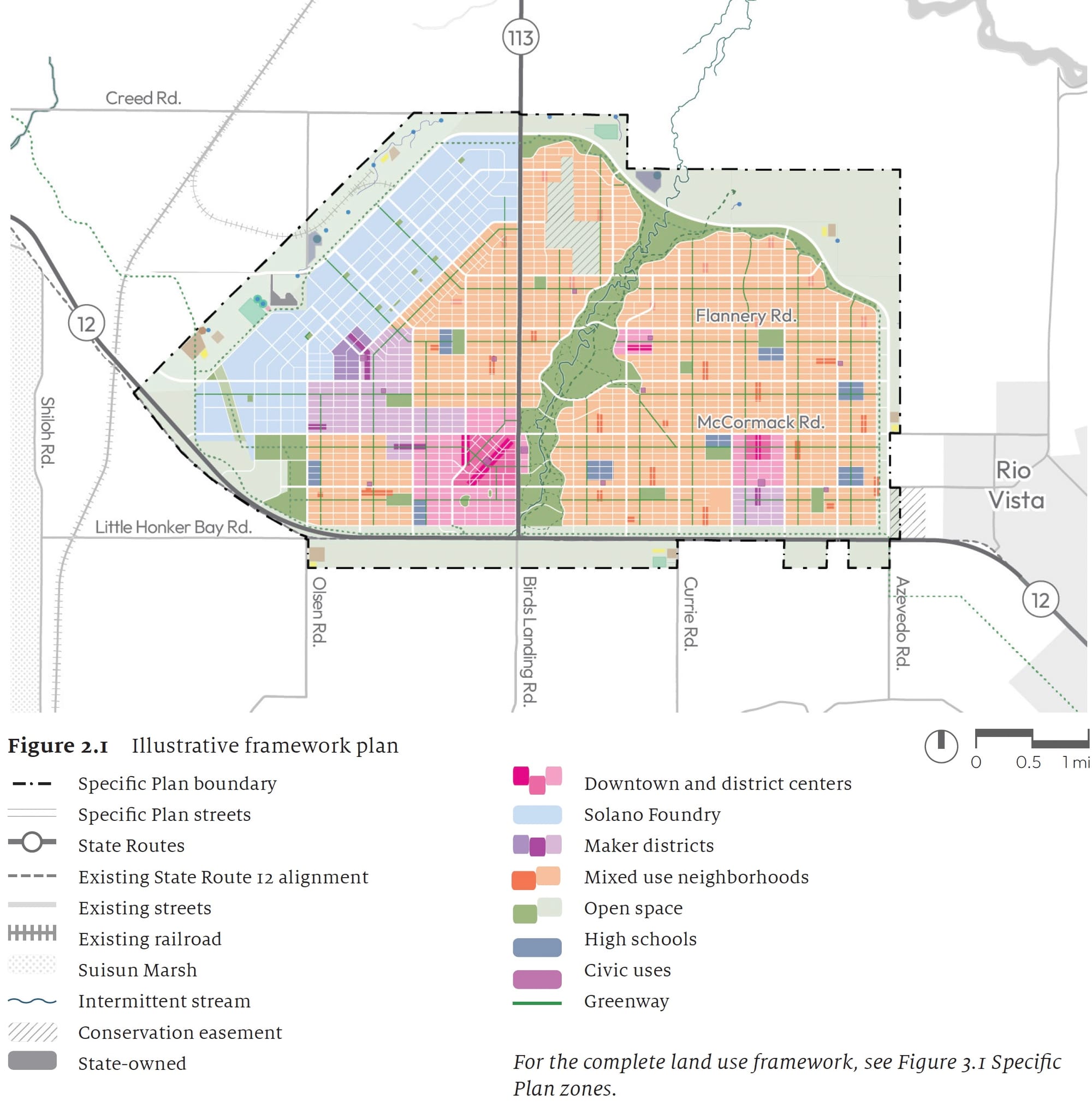 The Specific Plan divides the project into six primary areas — Downtown, Solano Foundry, Maker Districts East and West, District Centers North and East, and Central Park — each intended to create a walkable mix of housing, employment, and public amenities.