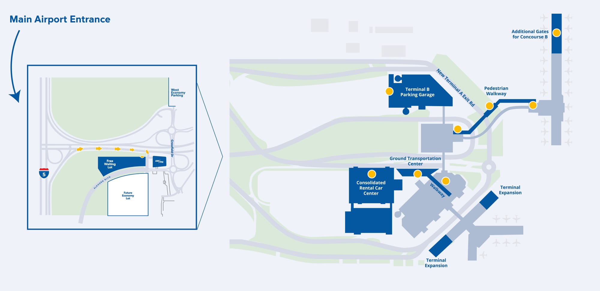 Future plans also include a consolidated rental car facility south of the terminals, which would replace the airport’s current shuttle-based rental system. Once built, the multi-level facility would house all rental car companies in a single location within walking distance of both terminals, allowing passengers to pick up and return vehicles without boarding a bus.