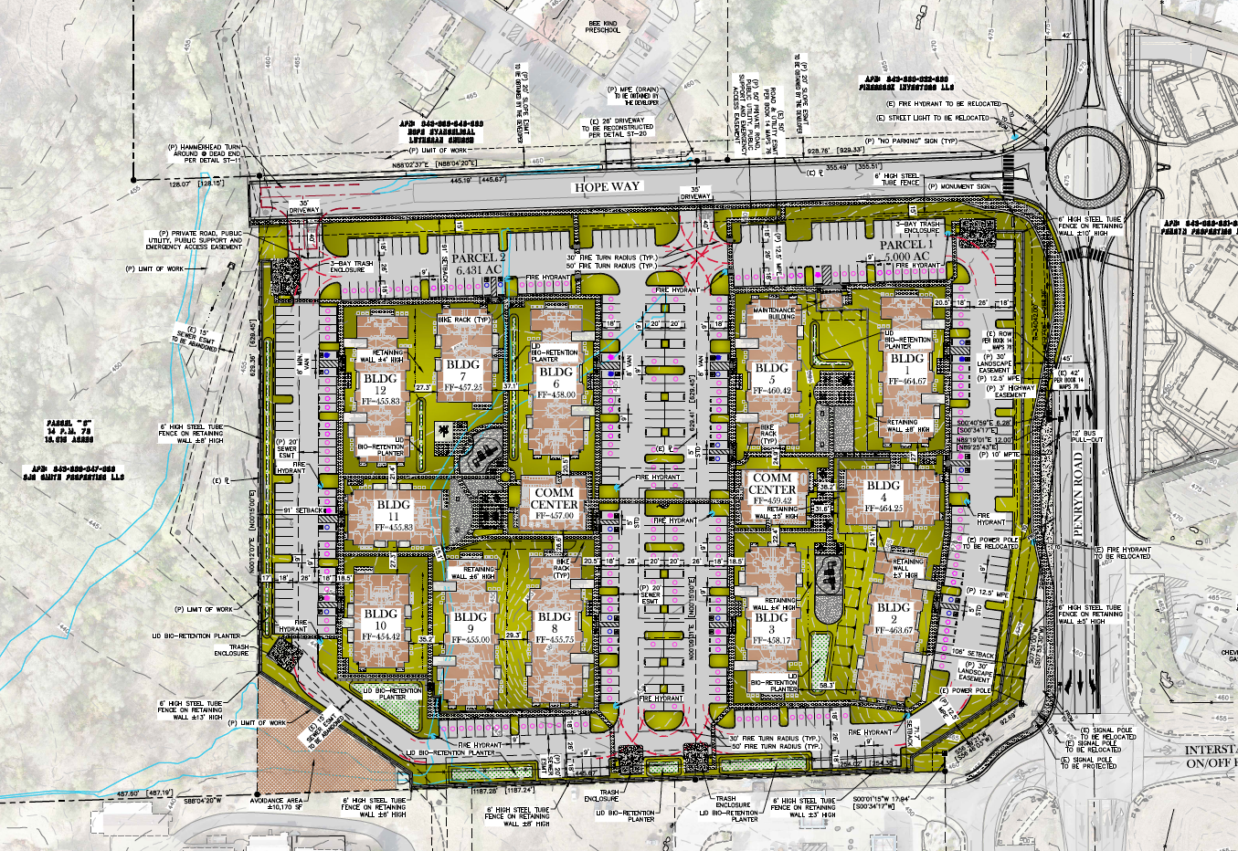 The project calls for twelve three-story buildings with a mix of one- to four-bedroom units, along with two single-story clubhouses, recreation areas, and outdoor amenities. Nearly all units would be income-restricted for households earning between 30% and 70% of the area median income, with affordability guaranteed for 55 years.