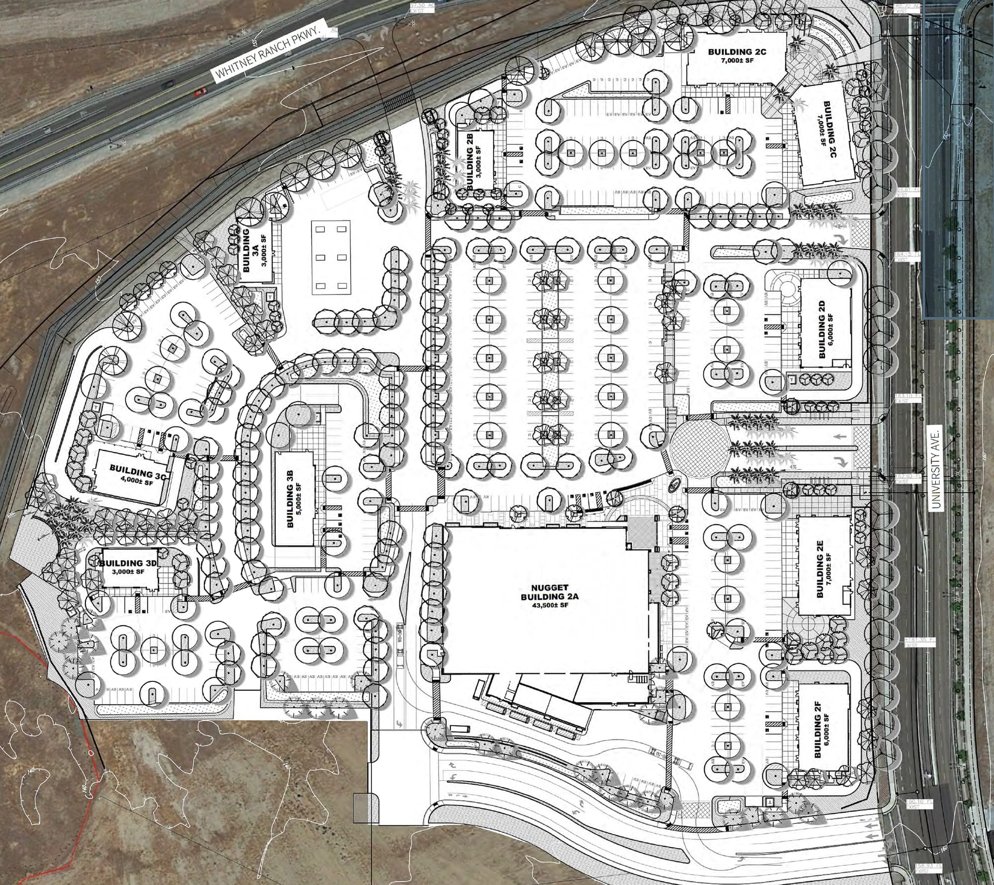 Aerial footage captured this week shows steady progress across the site. The Nugget building is nearly enclosed, and framing is underway on two pads at the southwest corner of Whitney Ranch Parkway and University Avenue. Three additional pads along University Avenue have been poured, outlining where the next phase of construction is set to rise.
